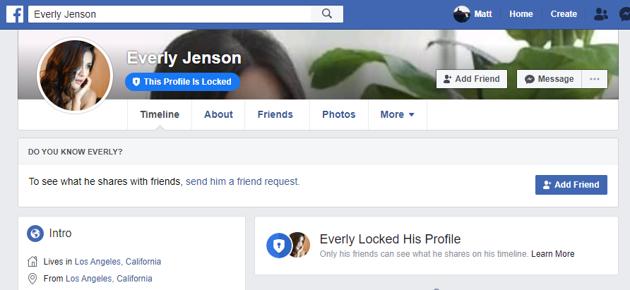 Locked profiles are a feature in Southeast Asia to help users protect their identities. Locked profiles don't exist in the US, and certainly not in Los Angeles (shown below). This one also seems to have his/her pronouns wrong, but we'll try to not judge. It's been common for male scammers to try to impersonate females.